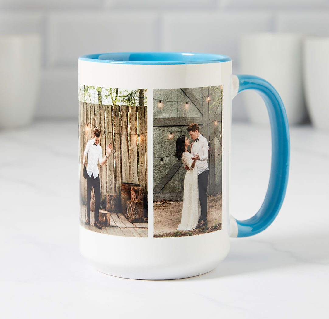 High Quality 15oz. ceramic mug with blue interior and handle. Add up to 4 of your favourite photos!