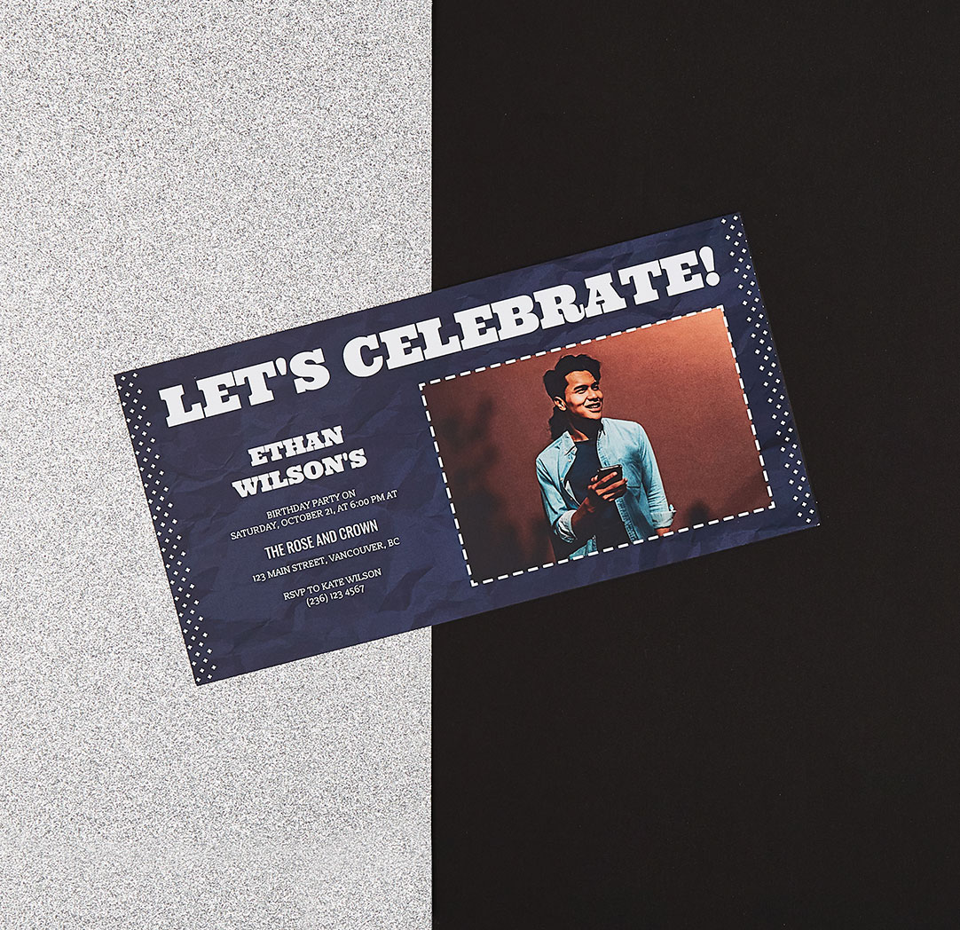 Invite family & friends to your next bash! Add up to 4 of your favourite photos and choose a professionally designed theme to get started. All themes are fully customizable, so be sure to make your invitation truly special and unique. Single sided print offering high quality, long-lasting image integrity on photography grade, 80lbs card stock. Includes white envelope.