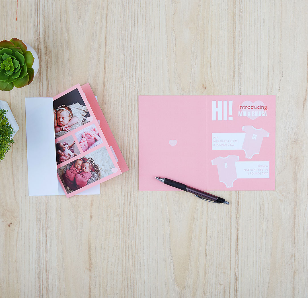 Announce something to the world. Add up to 8 of your favourite photos and choose a professionally designed theme to get started. All themes are fully customizable, so be sure to make your card truly special and unique. Double sided, folded and printed on bright white card stock. Includes white envelope.