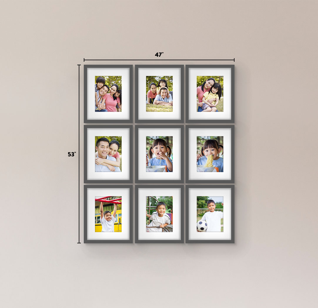 The perfect solution for that empty wall. Create a beautiful feature for your home with Gallery Wall Frames. Available in a variety of sizes ranging from 8x8 to 20x30 and available in different sets and combinations. Frames are available in Natural Wood, Black, White & Grey to match any décor or style. Whether you are hanging 1 frame or 9, each frame comes with a hanging template to make installation and spacing easy.