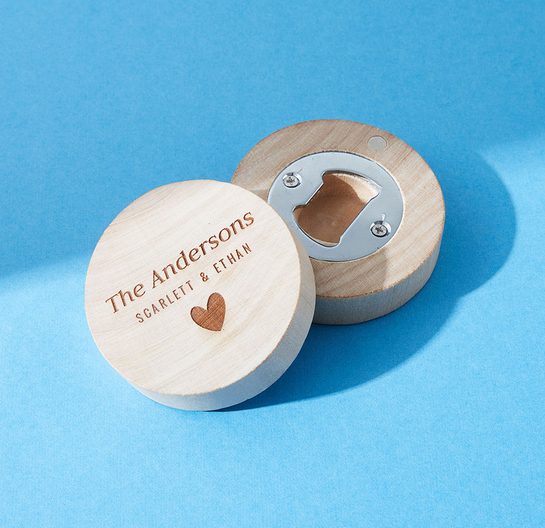 Small but mighty! This 2.5x2.5 round wood bottle opener makes it quick and easy to crack open a cold one. Includes magnets on the back so you can always keep it handy on the fridge. Made with precision laser engraving so that you can personalize it with a name, special message or quote!
