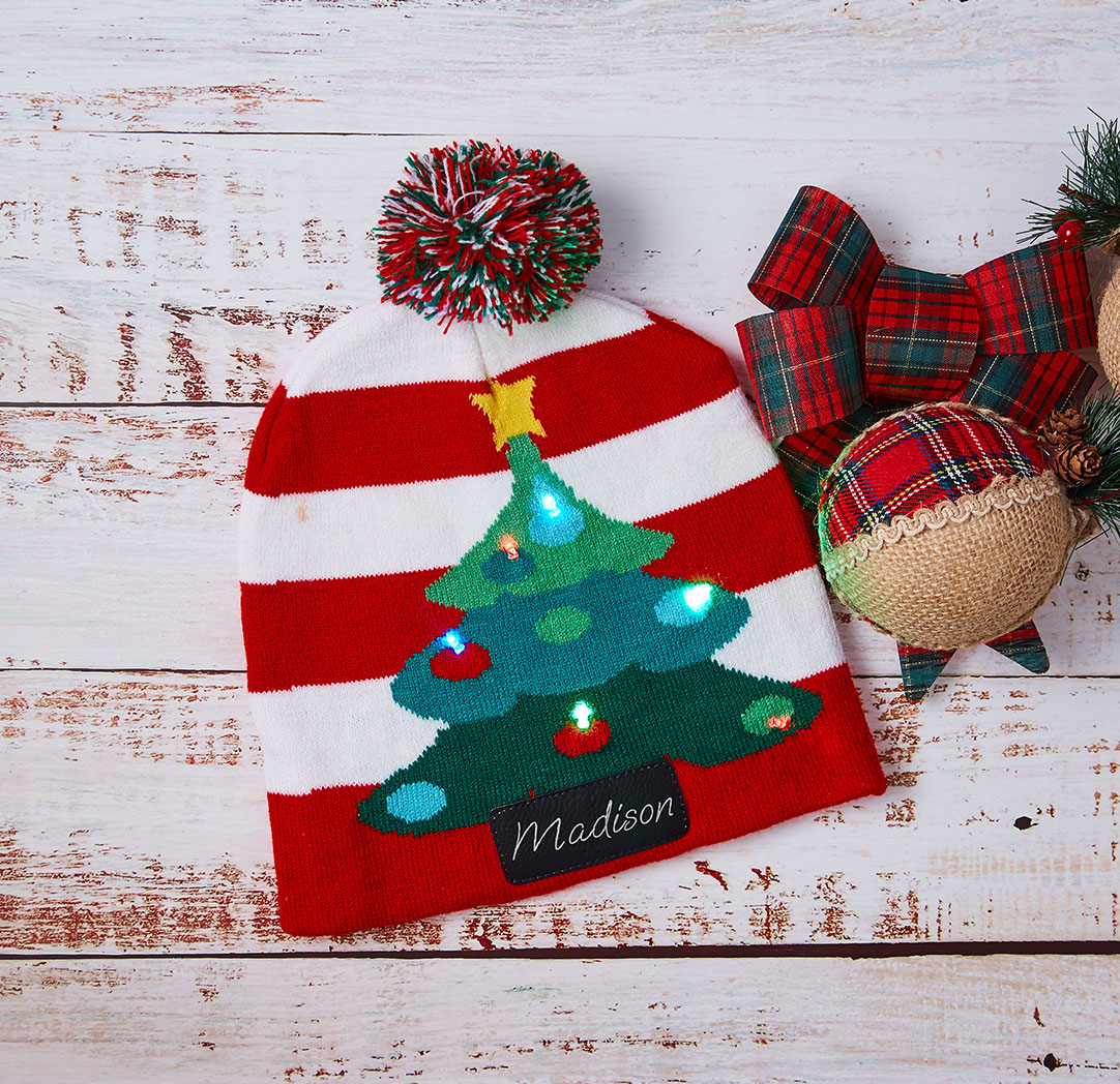 Show off your Christmas Cheer with Personalized LED Touques. These fun Christmas accessories pair best with an Ugly Christmas Sweater! Includes a laser engraved leather patch with your text revealed in silver. Available in 4 styles featuring Multicolour LED lights and 3 modes.