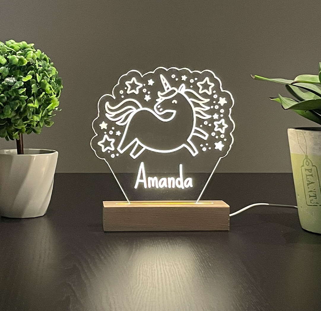 Compliment your décor, use it as a cake topper or maybe it can be the perfect nightlight for your little one. So many possibilities with the personalized LED signs. Available in a variety of designs and styles that are approximately 10" tall (heights may vary by design). Choose from a Black, Cracked Black, White or 2 styles of Wood base.