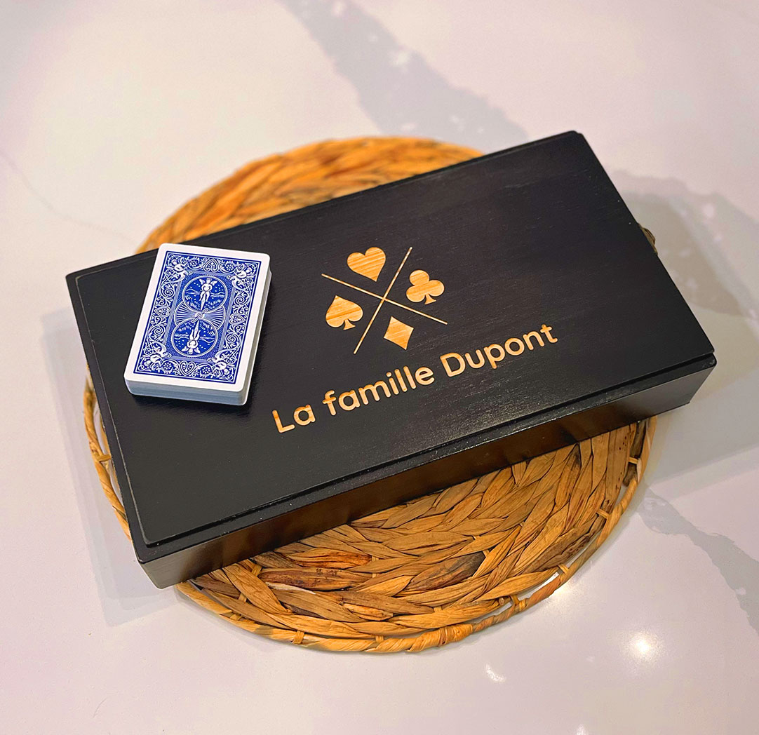 Ajoutez une touche de personnalisation à votre soirée de jeux en famille! Ce jeu de cribbage en bois de grande qualité est gravé au laser de précision avec votre design. Le dessus de la planche de jeu glisse et se verrouille pour contenir les pièces de jeu. Le jeu de cribbage inclut une base en feutre doux, la quincaillerie de verrouillage, un jeu de cartes à jouer Bicycle et 9 pions en métal.