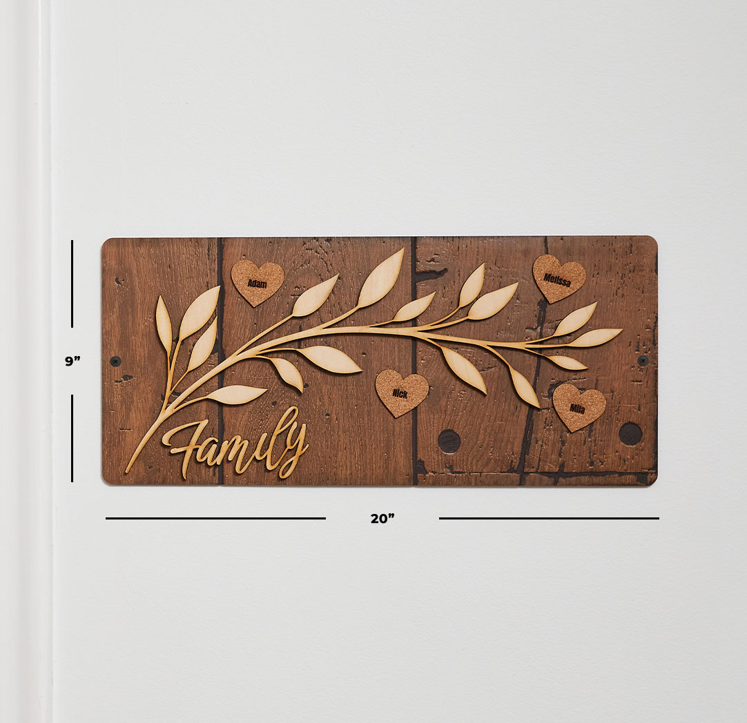 Ajoutez l’originalité de la personnalisation à votre décor. Ce panneau mural superposant du bois clair et de l’acrylique noir affiche jusqu’à 6 cœurs de liège personnalisés portant les noms des membres de votre famille. Le panneau mesure 9 x 20 pouces et est livré prêt à installer avec la quincaillerie incluse.