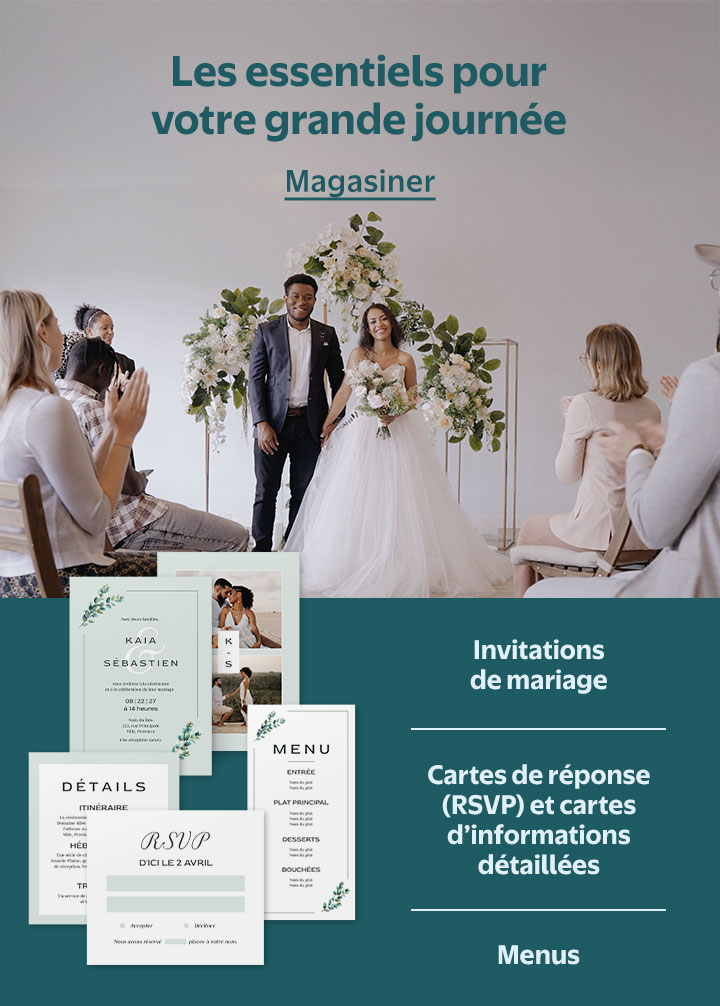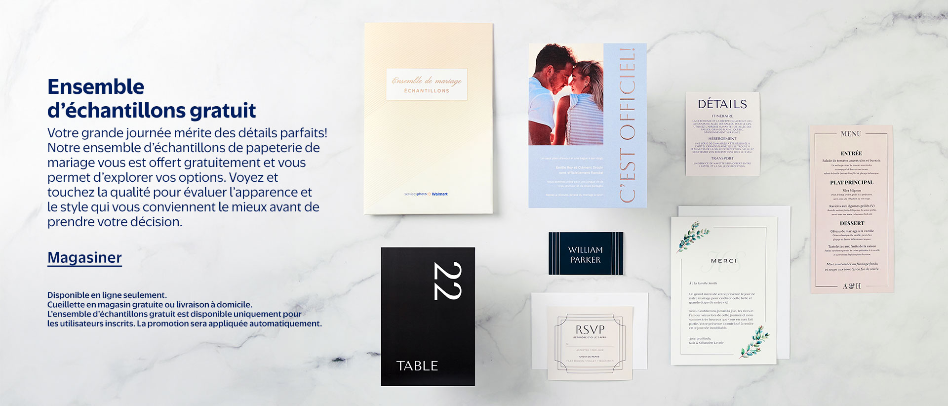 Notre ensemble d’échantillons de papeterie de mariage vous est offert gratuitement et vous permet d’explorer vos options. Voyez et touchez la qualité pour évaluer l’apparence et le style qui vous conviennent le mieux avant de prendre votre décision.